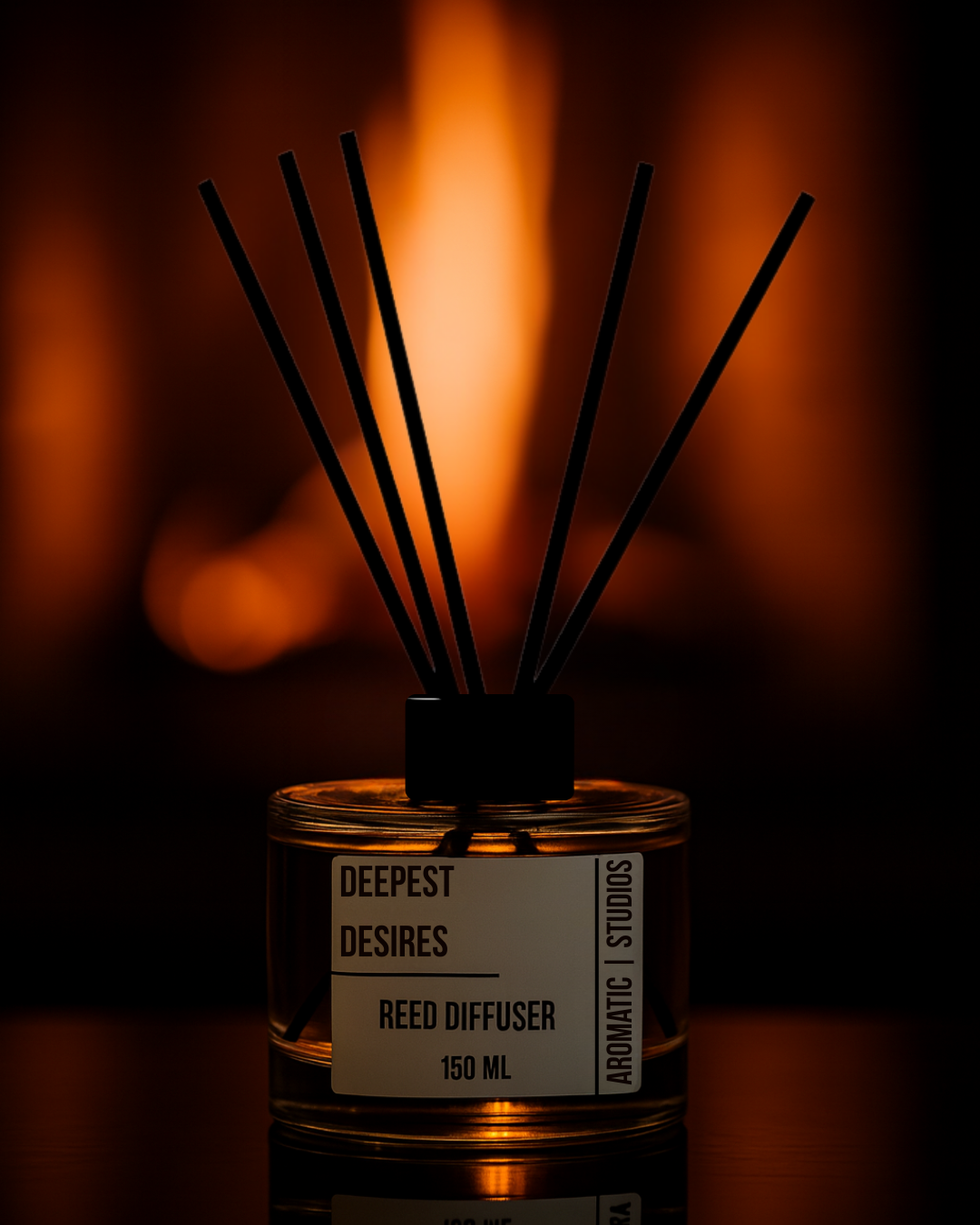 Deepest Desires is an indulgent escape into warmth and intimacy — a sophisticated blend where glowing campfire embers meet the creamy sweetness of toasted marshmallow. As the reeds release their scent, the air fills with notes of gently smoked woods, soft vanilla, and a whisper of caramelized sugar, wrapping your space in a cocoon of cozy elegance. Designed to feel like an evening by the fire — comforting yet refined — this diffuser transforms any room into an inviting retreat, balancing nostalgia with modern luxury.